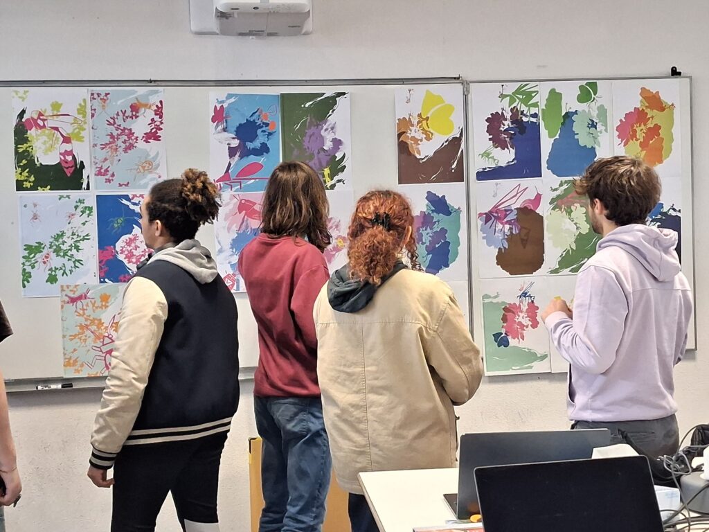 Les élèves de terminale Communication visuelle se sont associés aux étudiants en DNMADE Numérique de 3ème année pour imaginer et réaliser en sérigraphie un univers graphique riche et coloré inspiré par le minéral et le végétal. 3 jours où le numérique et l’artisanat ont permis de révéler la force de leur union. Ce moment de rencontre permet aussi aux lycéens de se projeter dans ce futur très proche qu’est le post-bac. Un grand Merci à toutes et tous, organisateurs et intermédiaires, élèves, enseignants et intervenants ainsi qu’à la Région qui finance ces opérations de rencontre.